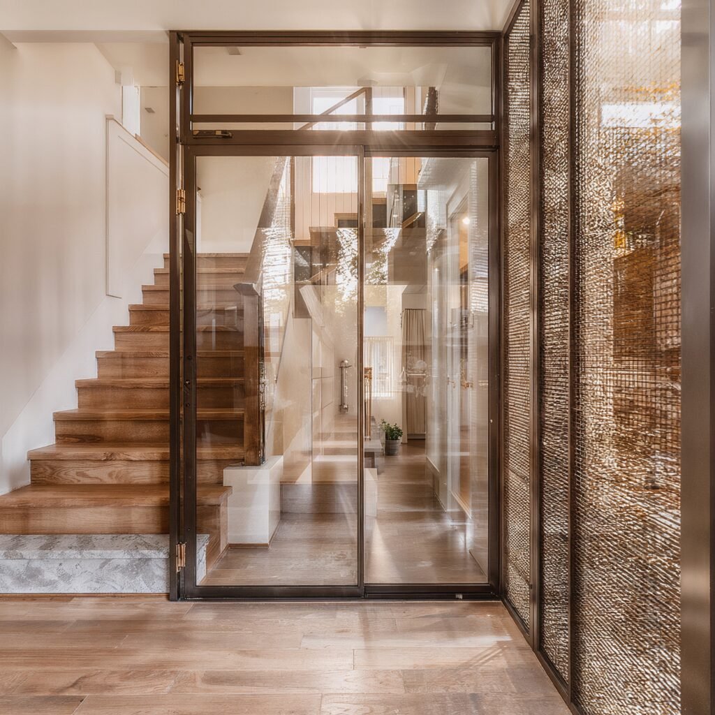 In diesem Projekt verbindet eine Lofttür aus bronzepulverbeschichtetem Stahl mit klaren Glasfeldern den Wohnbereich mit dem angrenzenden Raum. Die Tür steht frei zwischen den Wänden und schafft eine elegante Abgrenzung, sichtbar, aber nicht massiv. Das klare Glas lässt das Tageslicht ungehindert fließen, wodurch beide Bereiche weiterhin offen und verbunden wirken.