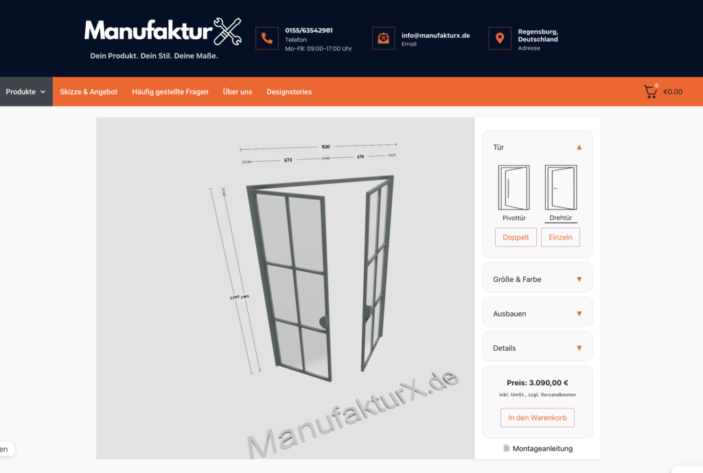 Preisunterschiede ergeben sich vor allem aus Größe, Rahmenbreite, Sprossenaufteilung, Glaswahl und Öffnungsart. Mit dem 3D-Konfigurator von ManufakturX sehen Kundinnen und Kunden den Preis in Echtzeit: Jede Änderung wird sofort sichtbar. Dadurch bleibt der Prozess transparent, und man erkennt klar, welche Faktoren den Preis beeinflussen.